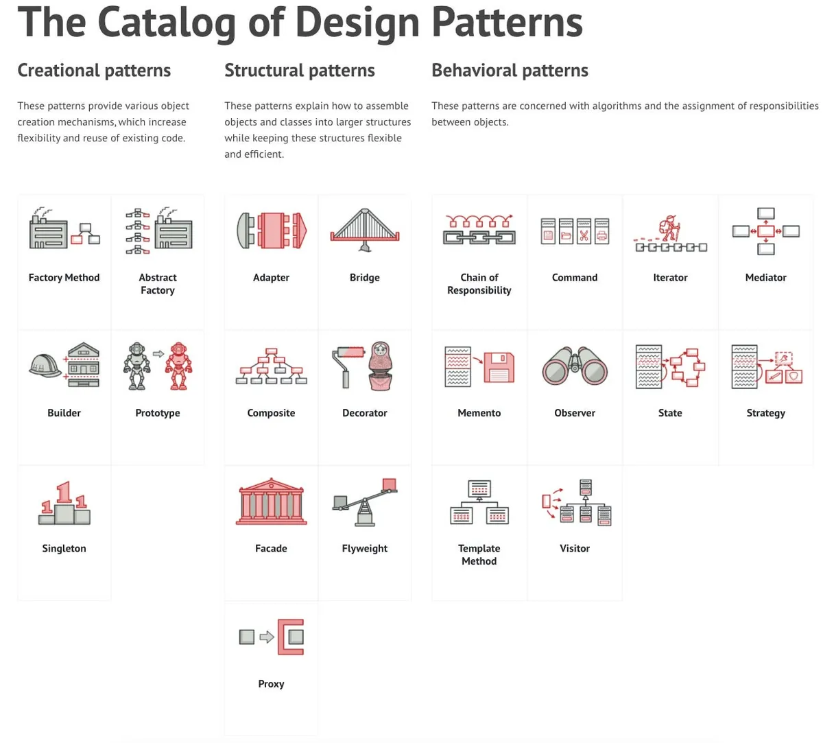 Due to space limitations, this article will not detail the architecture of each design pattern. Please click on the links for each pattern to understand their structures before continuing.