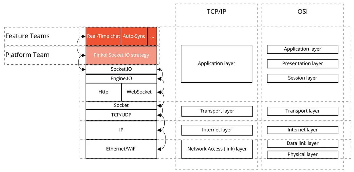 The main responsibility of the Platform Team layer is to bridge the logic between Socket.IO and the Pinkoi Server Side, providing support for upper Feature Teams during feature development.