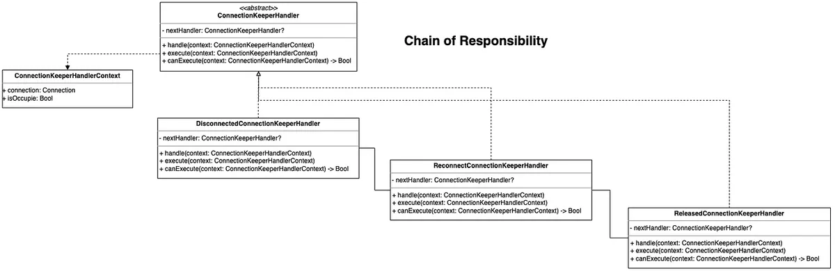 ConnectionKeeperHandleris the abstract node of the chain. ThecanExcutemethod is specially extracted to avoid the situation where this node handles the task but then wants to call the next node to continue execution. Thehandlemethod links the nodes in the chain, andexcutedefines the logic of how to process the task if it is handled.