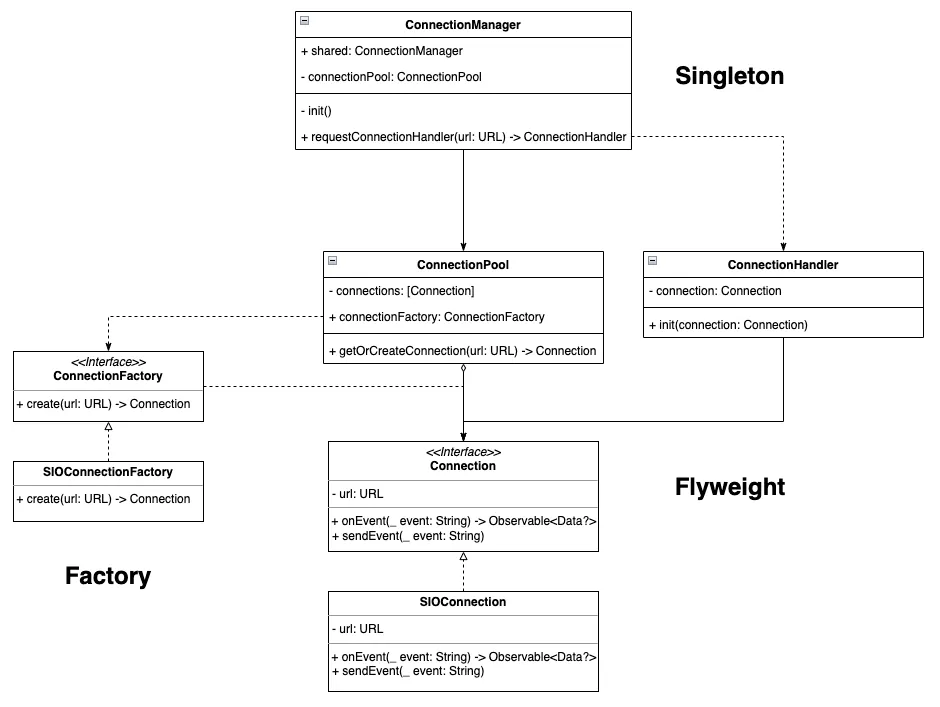 ConnectionManagerexists as a single instance throughout the App Lifecycle, managing access toConnectionobjects.Flyweight Pattern: The