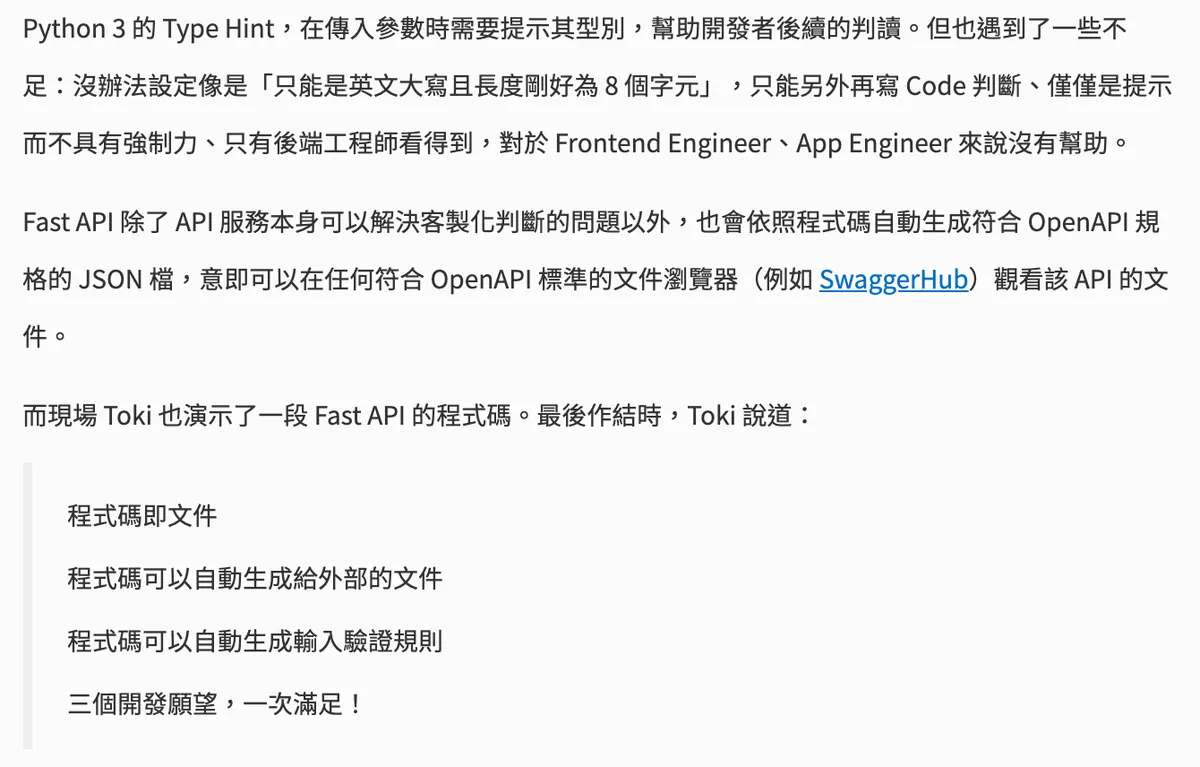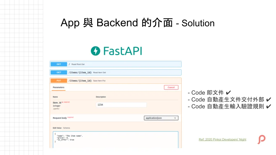 Pinkoi uses Python (FastAPI) to automatically generate documentation from API code. PHP can use Swagger (previous company practice); the advantage is that the overall structure and data format of the documentation can be automatically generated from the code, reducing maintenance costs and only requiring proper handling of field descriptions.