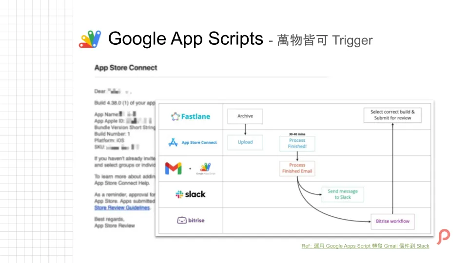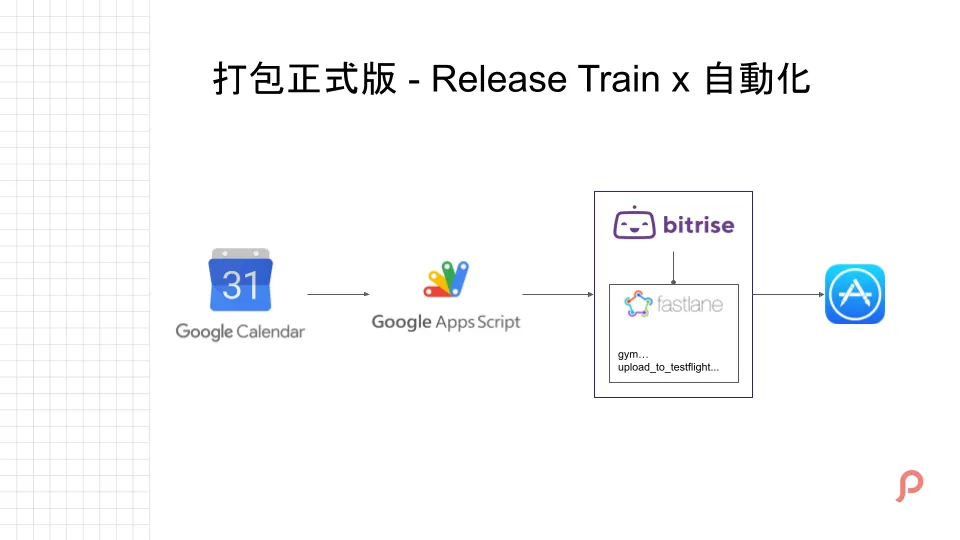 Since our schedule is fixed, we directly integrate Google Calendar here, adding the planned tasks to the calendar. When the time comes, Google Apps Script will call Bitrise to run Fastlane, packaging the official version and submitting the review script to complete all tasks.