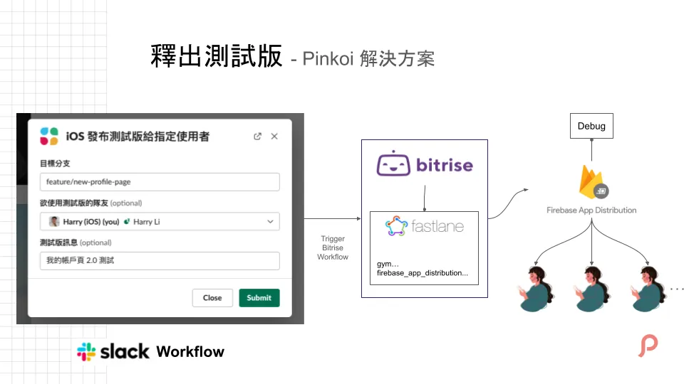 Pinkoi’s solution is to first separate the task of “having the App Team install the test version.” They use Slack WorkFlow as the input UI to achieve this. Once the input is completed, it triggers Bitrise to run a Fastlane script that packages and uploads the test ipa to Firebase App Distribution.