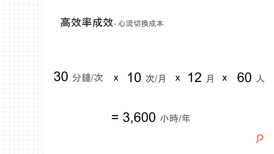 Besides the projects we just completed, we also need to evaluate the cost of flow switching. After working continuously for a period, we enter a “flow” state where our thoughts and productivity peak, enabling the most effective output. However, if interrupted by unnecessary matters (e.g., redundant communication, repetitive tasks), it takes time to return to flow again. Here, we use 30 minutes as an example.