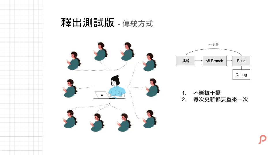 The first repetitive issue is when we want to let teammates test the app early during development. Traditionally, we just borrow a phone to build the app. If there are only 1-2 people, it’s not a big problem, but if the team has 20-30 testers, just installing the test versions can take the whole day. Plus, if there are updates, the entire process has to be repeated.
