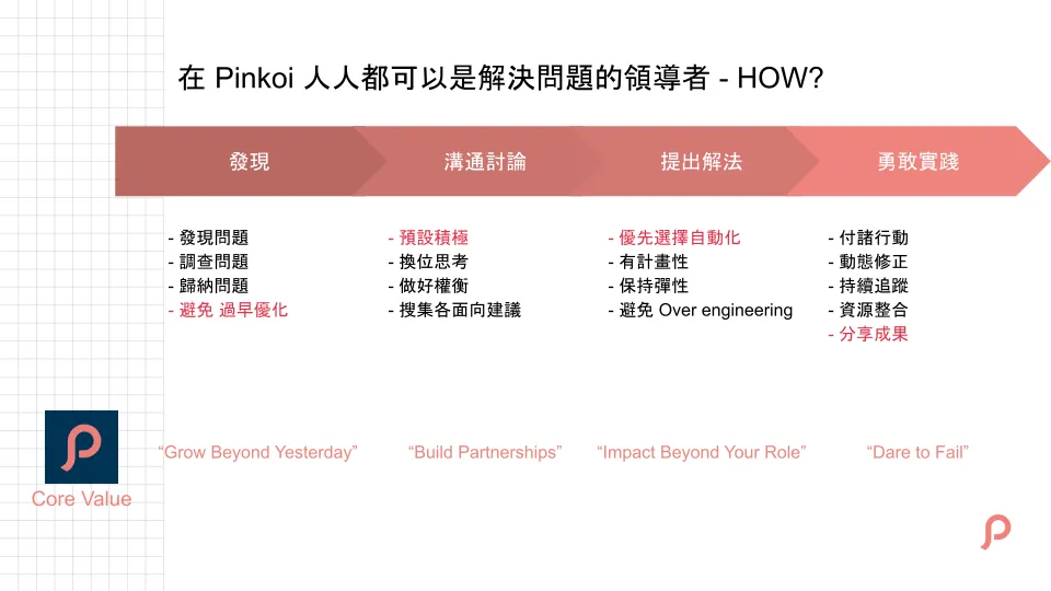 Regarding how team culture supports driving change, the four stages of problem-solving can all be linked to Pinkoi’s Core Values.