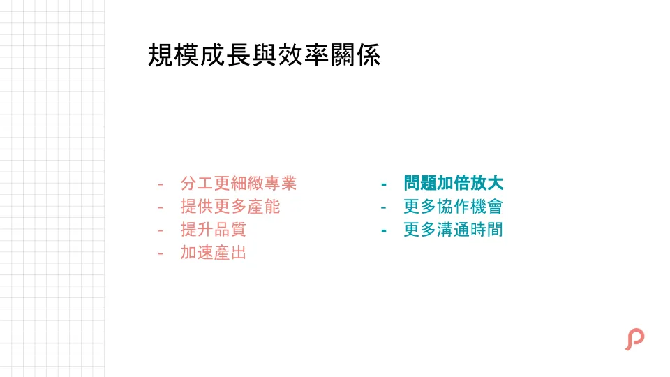 The relationship between team size growth and work efficiency: I have experience in startups with teams of 10 people up to teams of 100 (haven’t yet experienced teams of 1,000). Just growing from 10 to 100, a tenfold increase, makes a significant difference in many aspects.