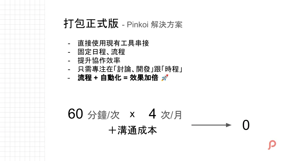 At Pinkoi, anyone can be a problem-solving leader. You don’t have to be a Lead or PM to solve problems. Many communication interfaces, tools, or automation projects introduced earlier were discovered by teammates who proposed solutions, and everyone worked together to complete them.