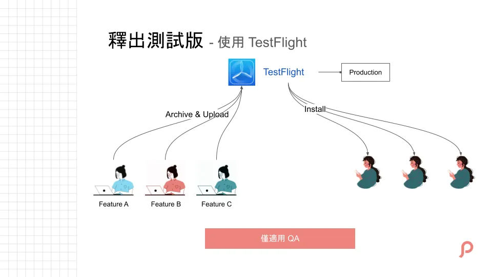 Another method is using TestFlight as a beta release platform, which I think is also good; but there are two issues. First, TestFlight is equivalent to a Production environment, not Debug. Second, when many teammates need to test different features simultaneously during development, TestFlight can get chaotic, and the packaged builds will be frequently changed. However, it is still feasible.