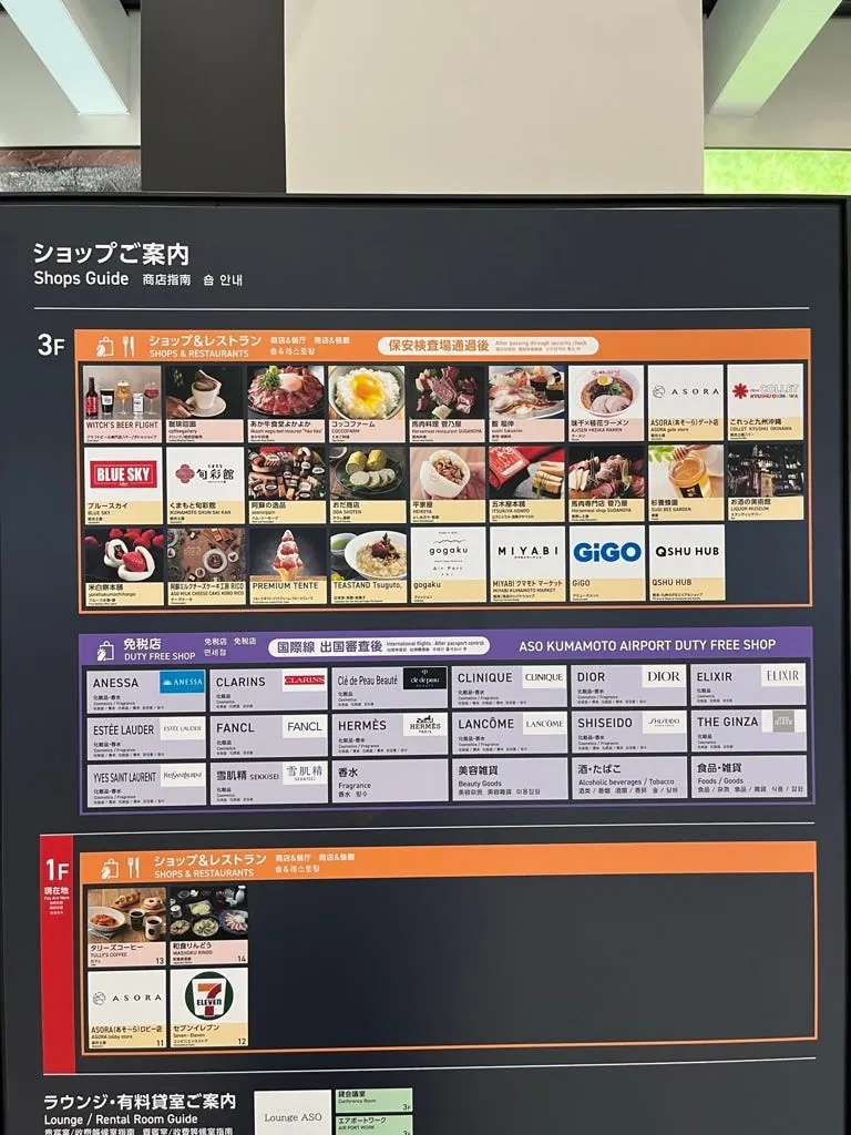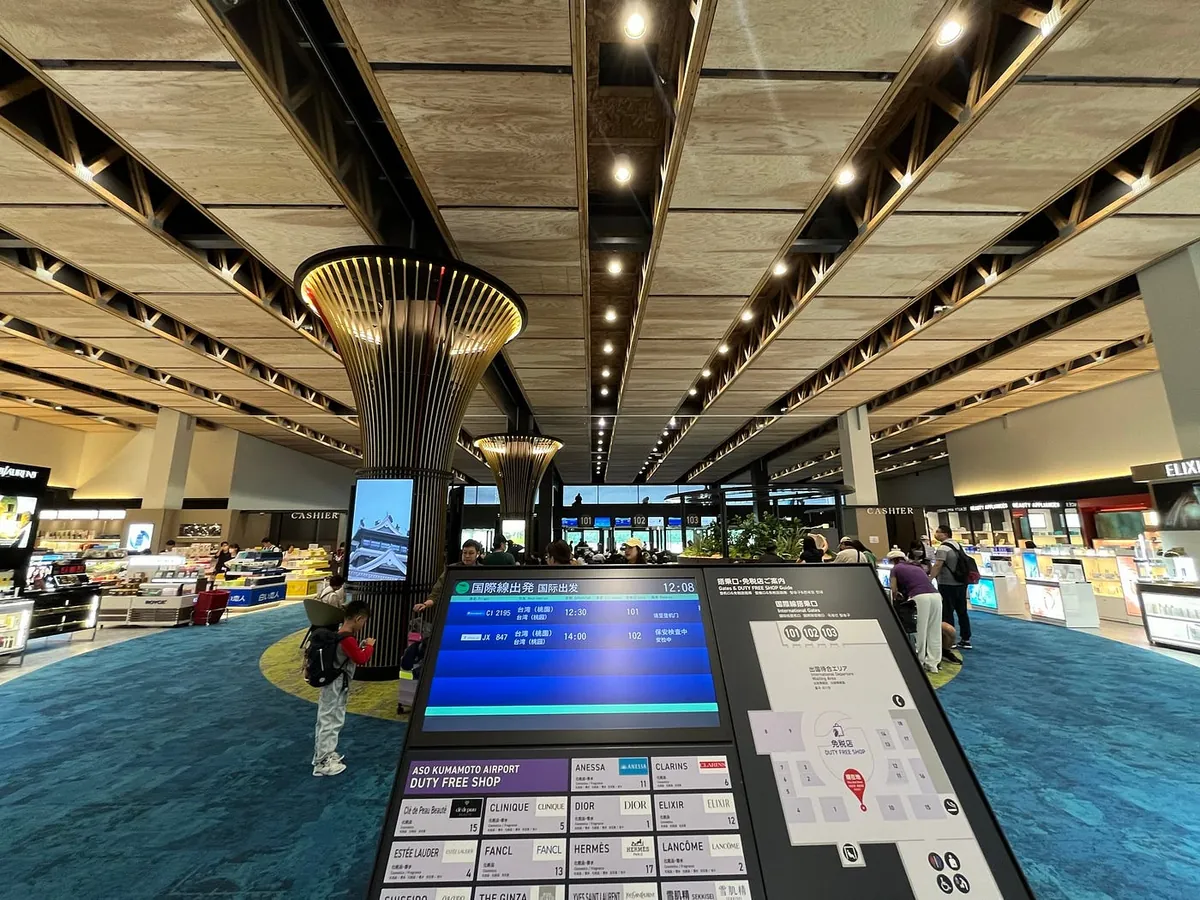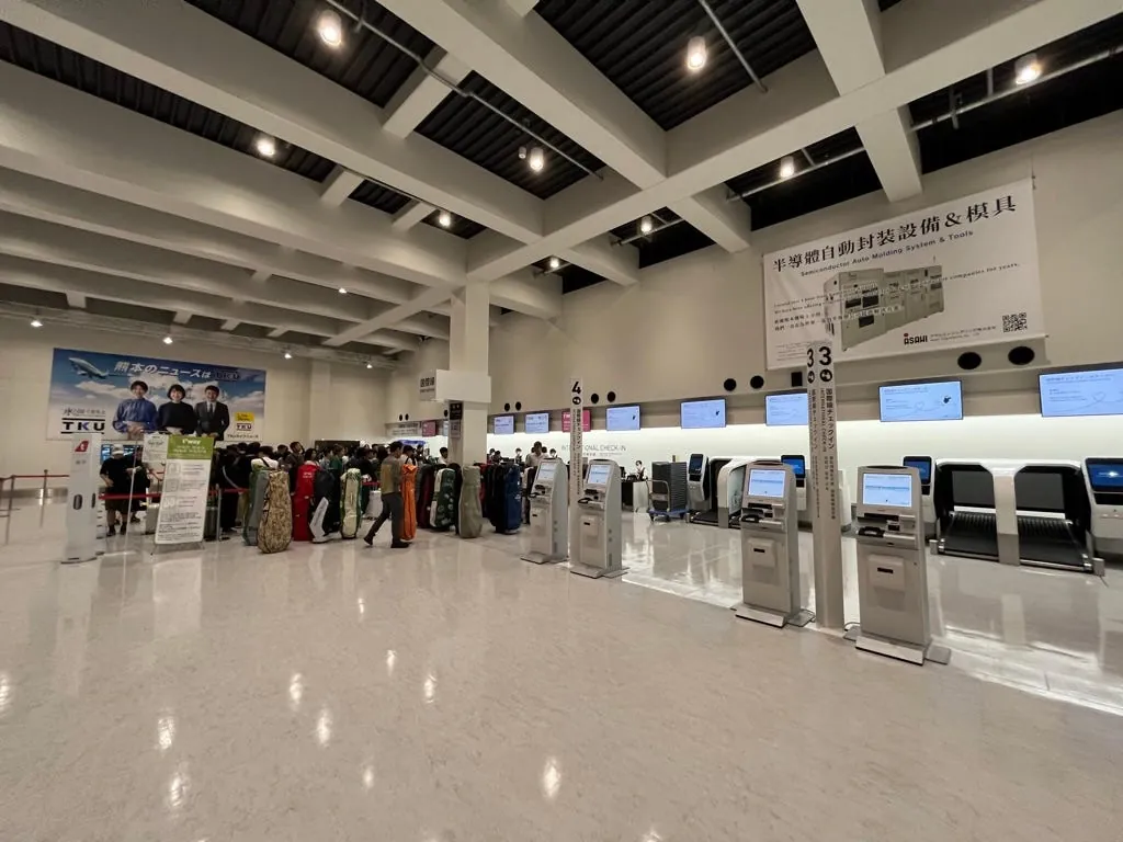 Aso Kumamoto Airport (KMJ) is very new and small, with limited flights; today there are only three international flights, and the international section has just three counters, all used in rotation.