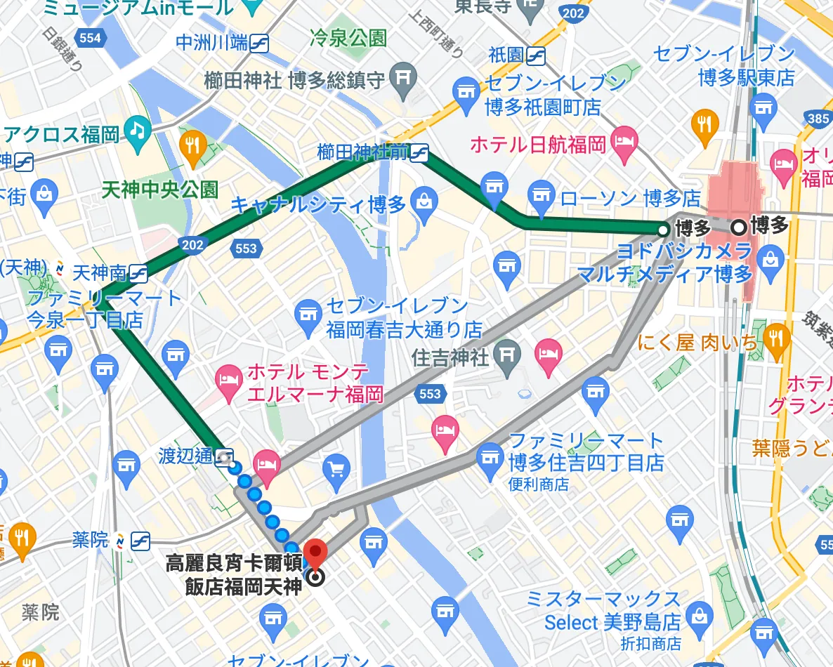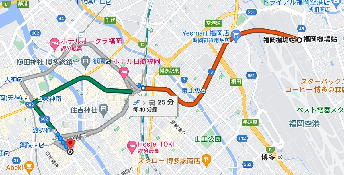 Taking the subway to Hakata is too indirect. It’s faster to walk to Watanabe-dori and take a bus to Hakata.