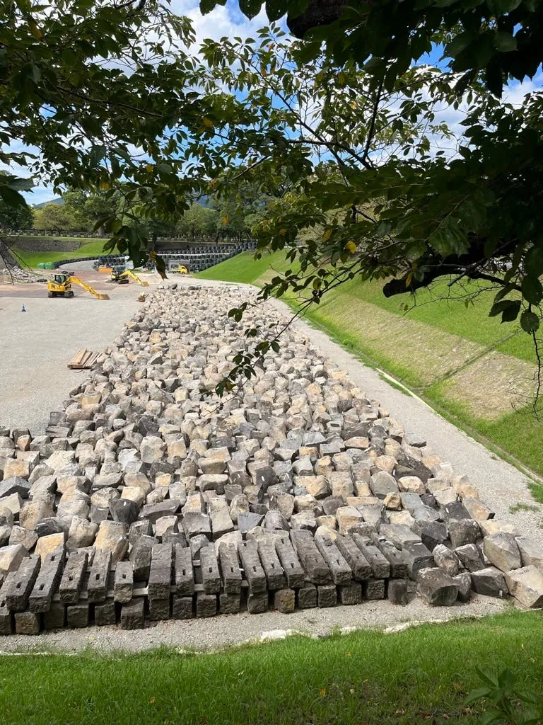 You can see the slope turning up ahead leading to Kato Shrine. You can also see the area under repair behind the main keep from the first day, along with many scattered castle walls that need to be restored one by one.