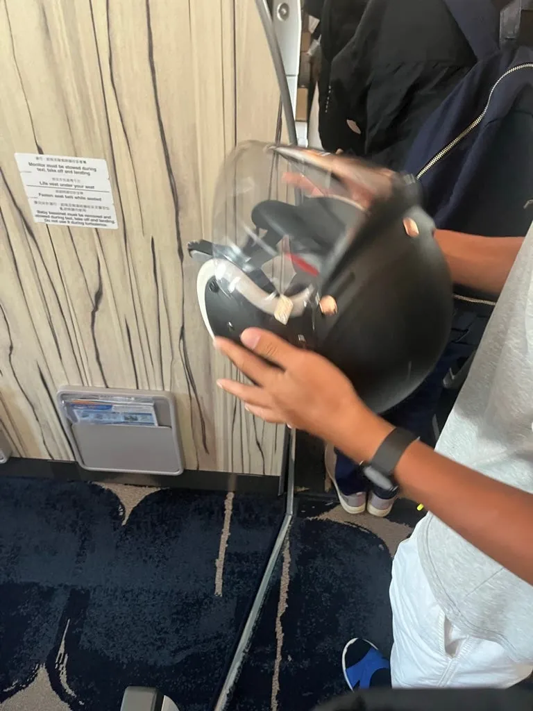 When getting off the plane, I noticed the person in front of me was wearing a helmet. Did they ride a scooter to catch the flight? 🤣
