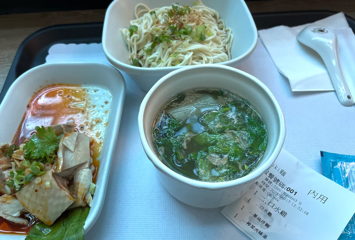 I casually ate an expensive but ordinary spicy chicken dish, then checked the luggage area; my luggage was also checked through to the airport.