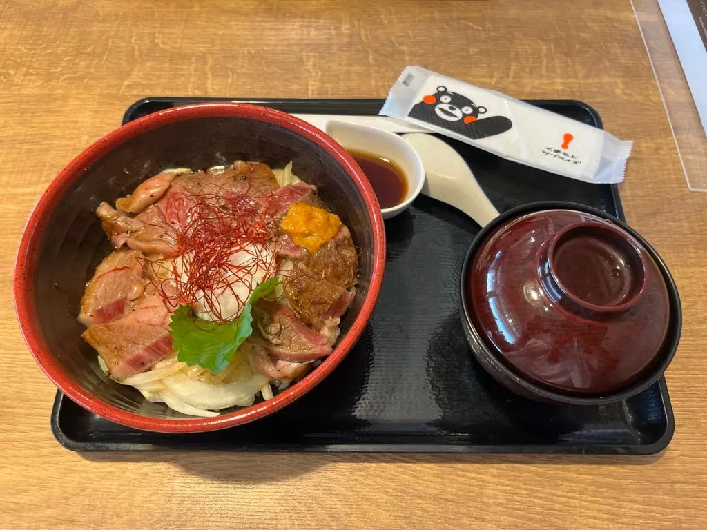 Went shopping at Sakura Town Shopping Center, then had Miyazaki beef again paired with beer from Kumamoto; before leaving, bought a Kumamon daifuku to bring back to Taiwan as a souvenir (so cute).