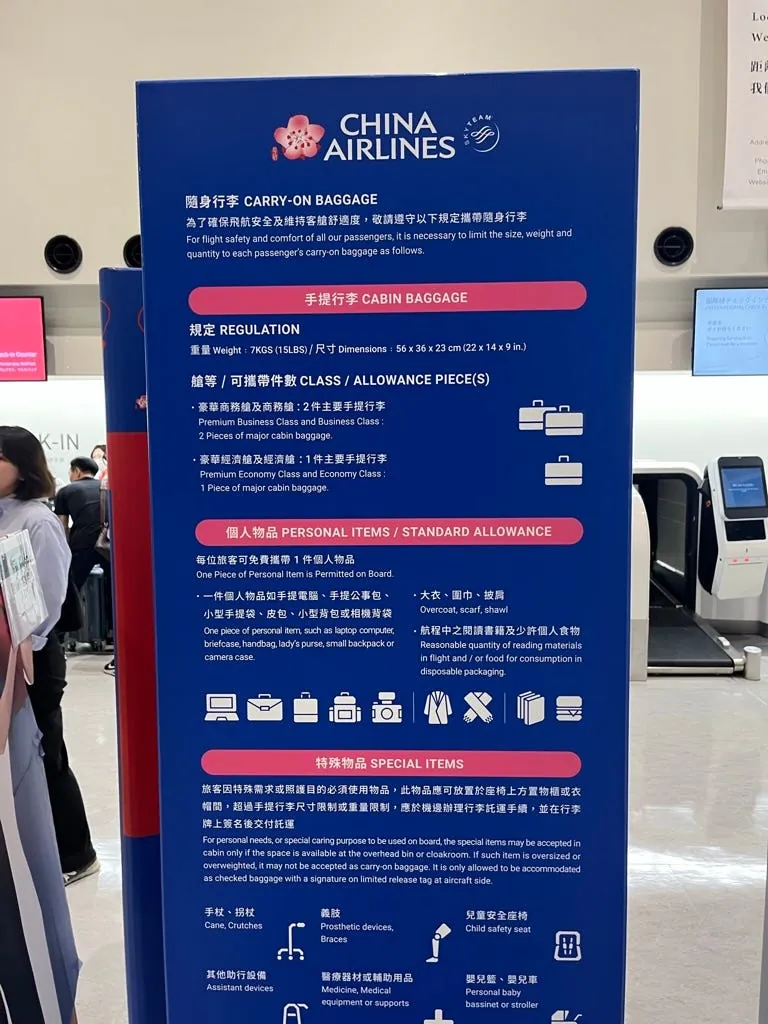 Check-in and baggage drop open around 10:20. Previously, I flew EVA Air (allowed two carry-ons), but this time with China Airlines, only one carry-on is allowed. I quickly compressed my items into one bag on site.