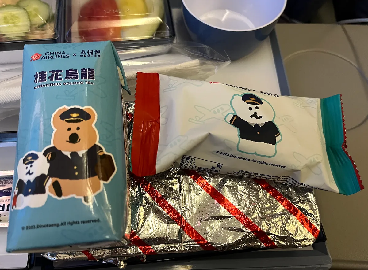 China Airlines partners with Wu Tong Hao to create the cutest dessert in the sky, featuring Dinotaeng, the adorable short-tailed kangaroo. The osmanthus oolong tea is also quite tasty.