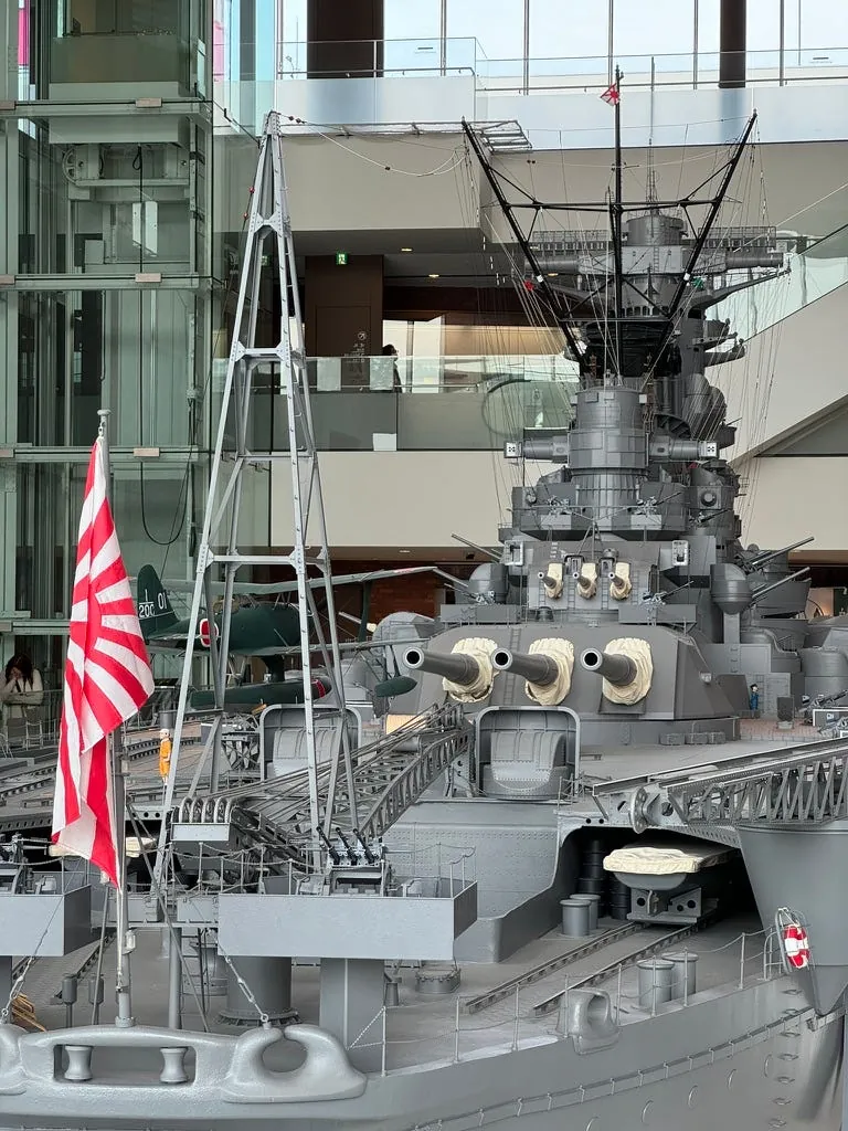 Inside, there is a Yamato battleship model that can be viewed up close in 360 degrees, with almost full detailed accuracy. There are also exhibits on battleships, war history, fighter planes, cannons, and more—an unmissable experience for battleship and military enthusiasts. Additionally, there is a special exhibition on Japanese aircraft carrier design and development history, including original design manuscripts.