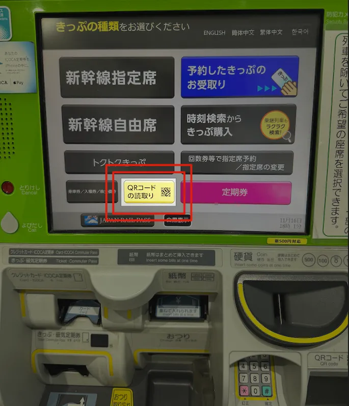 Finally, after several attempts among a group of Taiwanese, we discovered that you need to use the yellow button labeled “QRコードの読取り” at the bottom left to redeem. Clicking it allows you to scan the QR Code directly. (It is suspected that the JR machine has been updated)