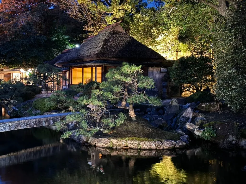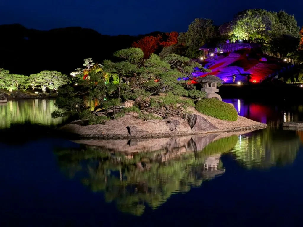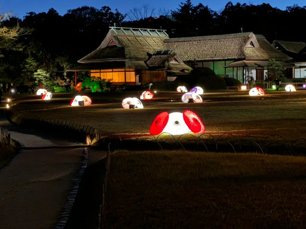 The first stop is Okayama Korakuen Garden. The evening illumination creates a romantic and beautiful atmosphere.