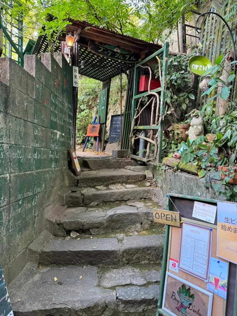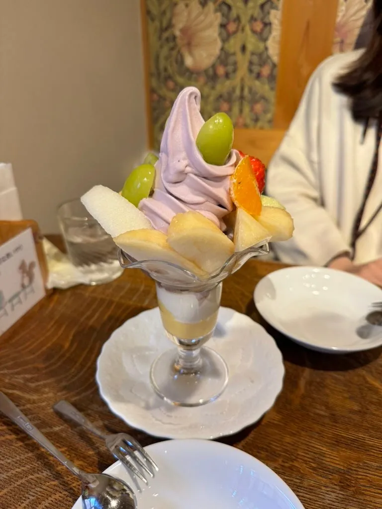After eating, continue exploring. When tired, go to パーラー果物小町 to try their fruit parfaits. The staff wear Taisho-era maid outfits. The parfait features Okayama Seio grapes and fruit ice cream, with grapes so sweet they tingle.