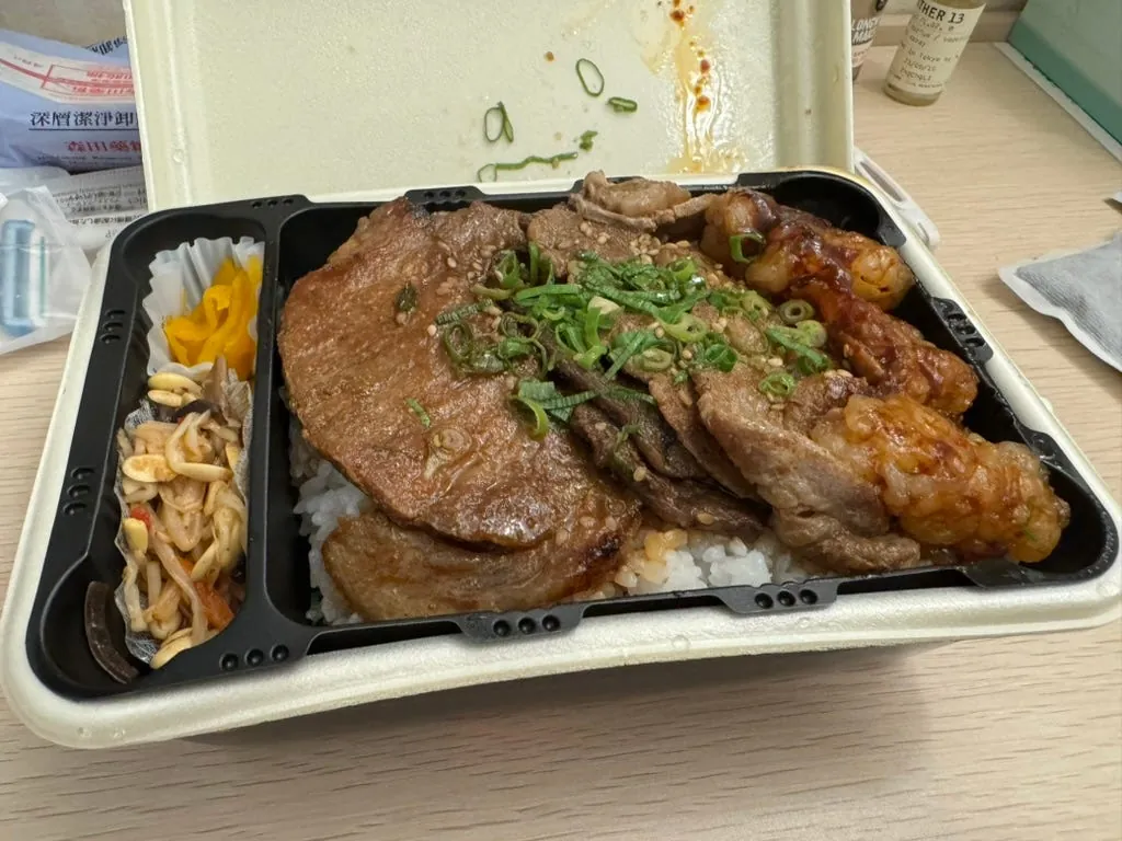 Staying up this late, having a midnight snack is totally reasonable! Still going with Y1000 + milk + convenience store hot food.