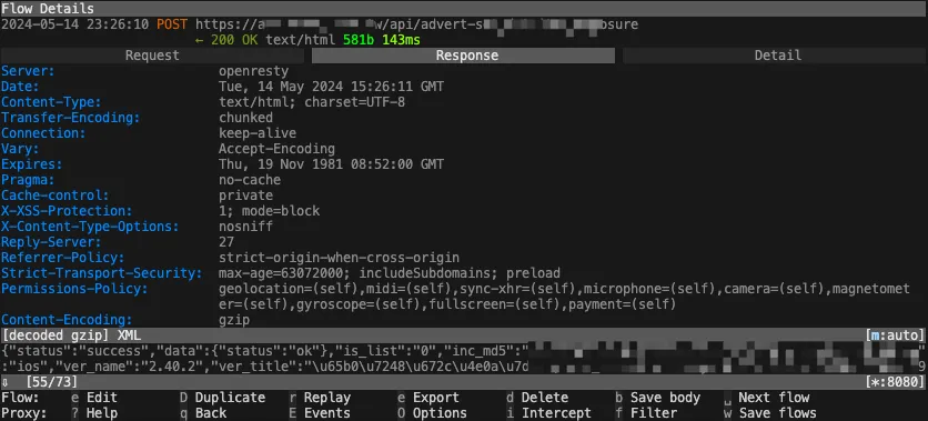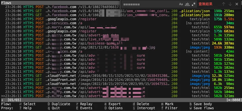 Back in the Terminal mitmproxy, you can see all captured API request logs while operating the app on your phone.