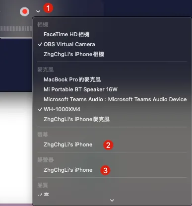 - After exiting the recording interface, click the “v” next to the 🔴, and select your connected phone for the screen and speaker.