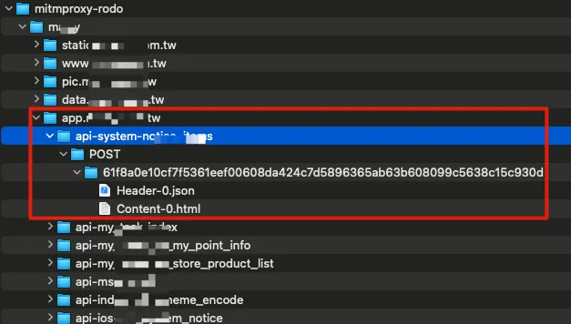 While operating, you can see the output directory contains many captured API Response Data, stored according to Domain -> API Path -> HTTP Method -> Hash Value -> Header-X / Content-X (if the same Hash is requested twice, they will be saved sequentially).