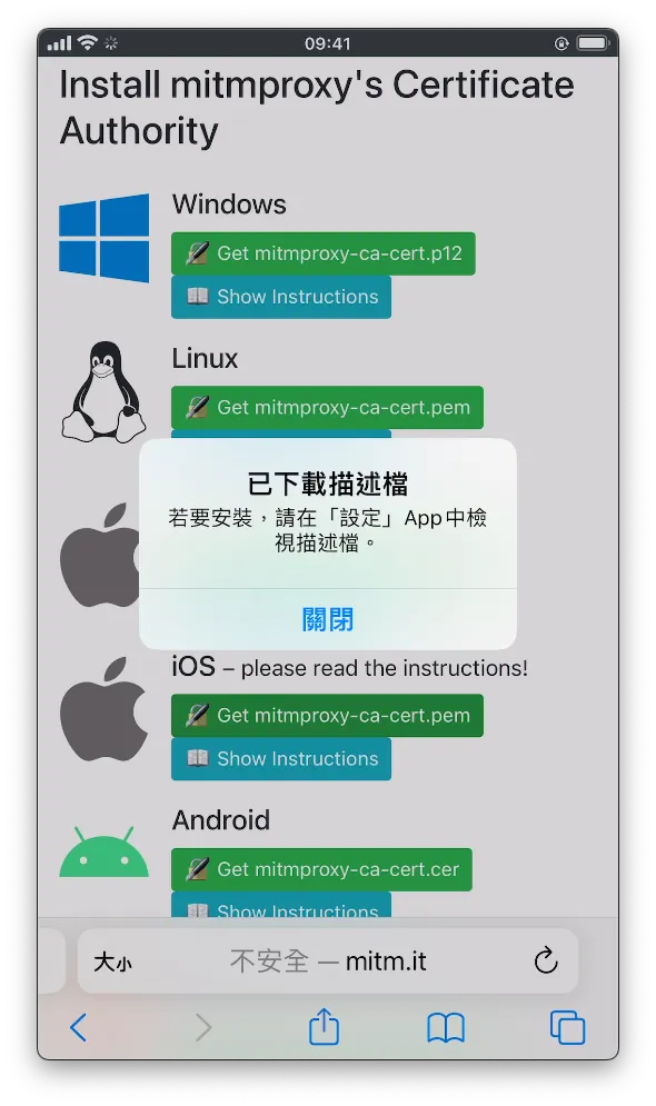 Indicates a successful connection. We found the iOS section and clicked “Get mimproxy-ca-cert.pem.”