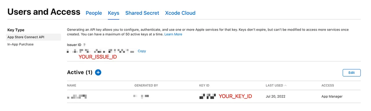 First, log in to the App Store Connect backend, go to “Users and Access” -> “Keys” -> “App Store Connect API”: