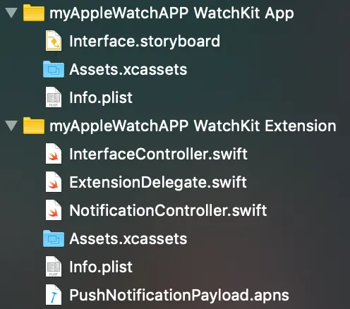 /info.plist: Same as iOS, WatchKit App related settingsWatchKit Extension: Responsible for program calls and logic processing (*.swift)
