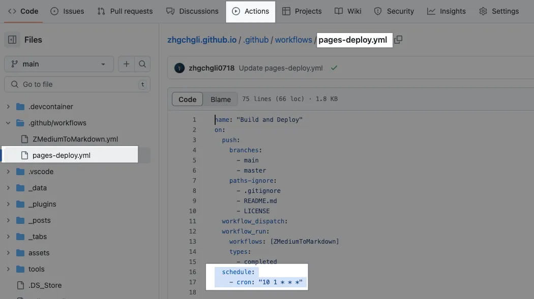 In the Jekyll (Chirpy Theme) repo project, find the Actions and locate pages-deploy.yml. Add the following under on::