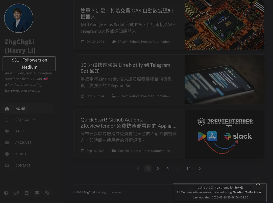 Extend the use of this tool by deploying the downloaded Markdown as a static backup mirror website on Github Pages using Jekyll (Chirpy Theme) — https://zhgchg.li/