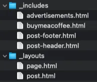 Then in post.html, we can directly use {% include buymeacoffee.html %} to include the HTML content of that file for reuse.