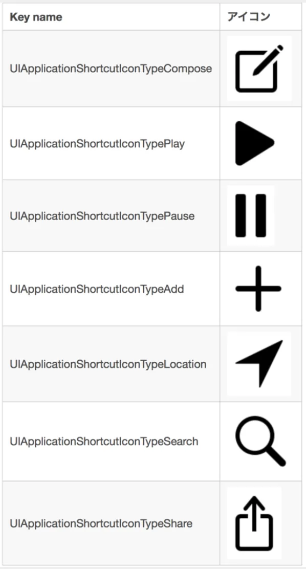 UIApplicationShortcutItemIconFile: Use a custom icon (size: 35x35, monochrome), choose either this or UIApplicationShortcutItemIconType