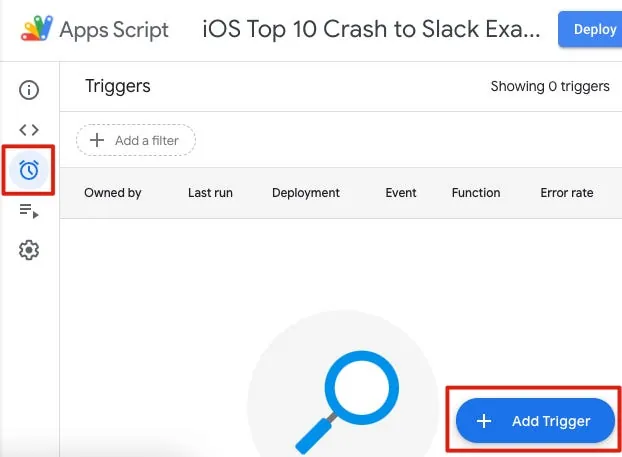 Select the alarm icon on the left, then choose “+ Add Trigger” at the bottom right.