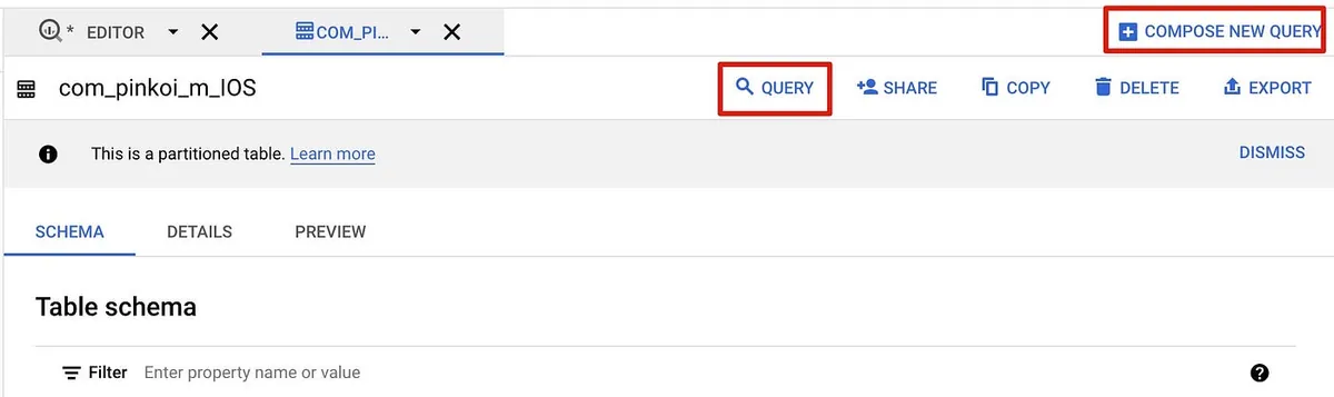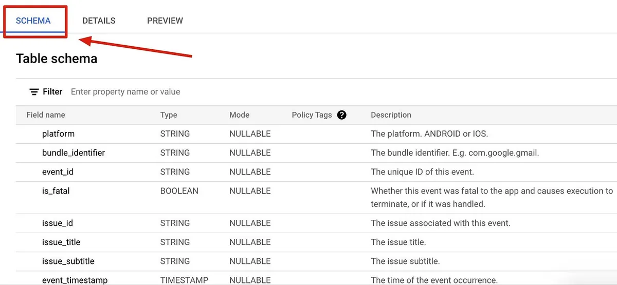 The top tab allows you to switch to “SCHEMA” to view the table’s column information or refer to the official documentation.
