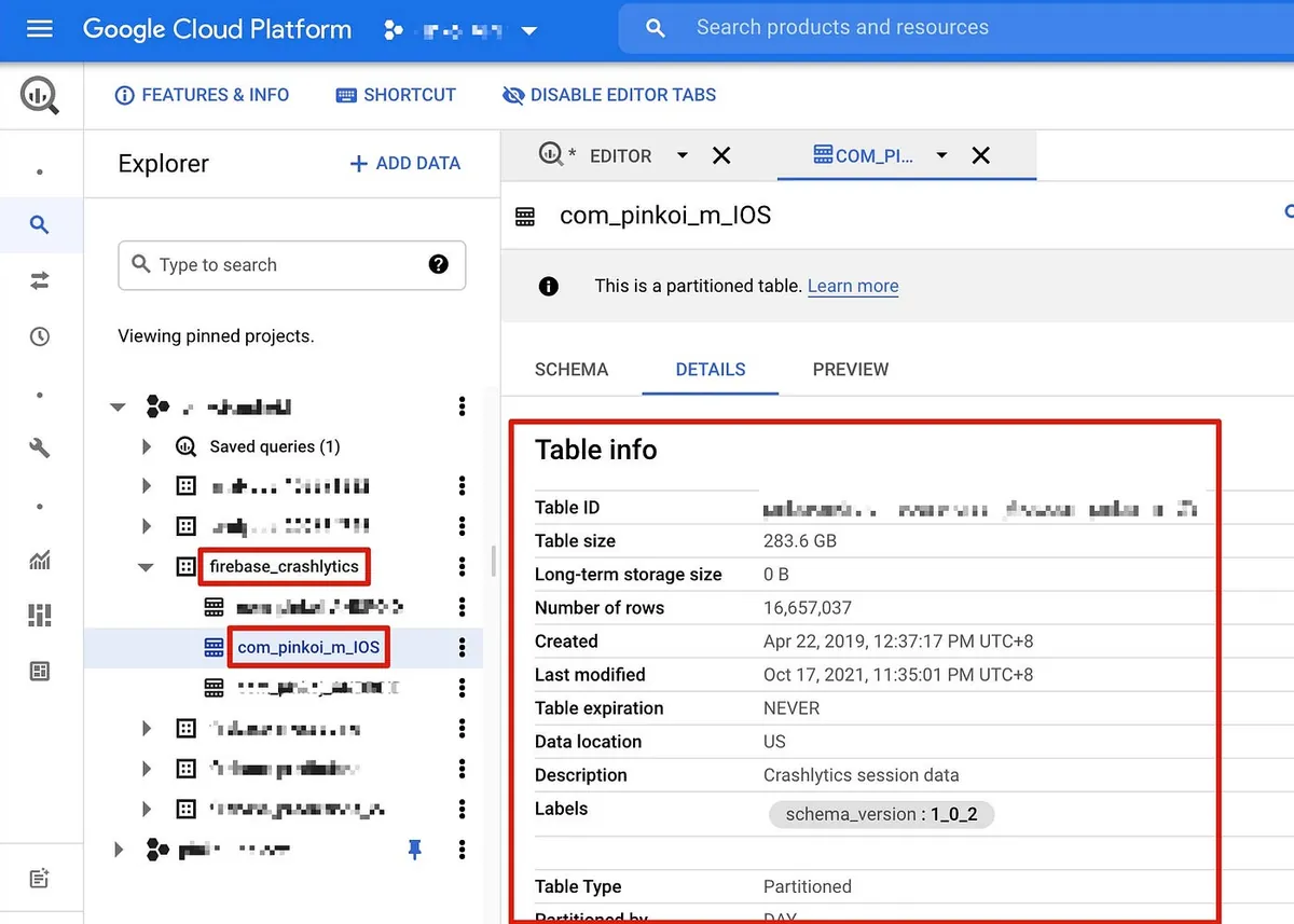 Go to GCP -> Big Query, then in the left “Explorer” select “firebase_crashlytics” -> choose your Table name -> “Detail” -> on the right, you can view Table information, including last modified time, used storage, retention period, and more.