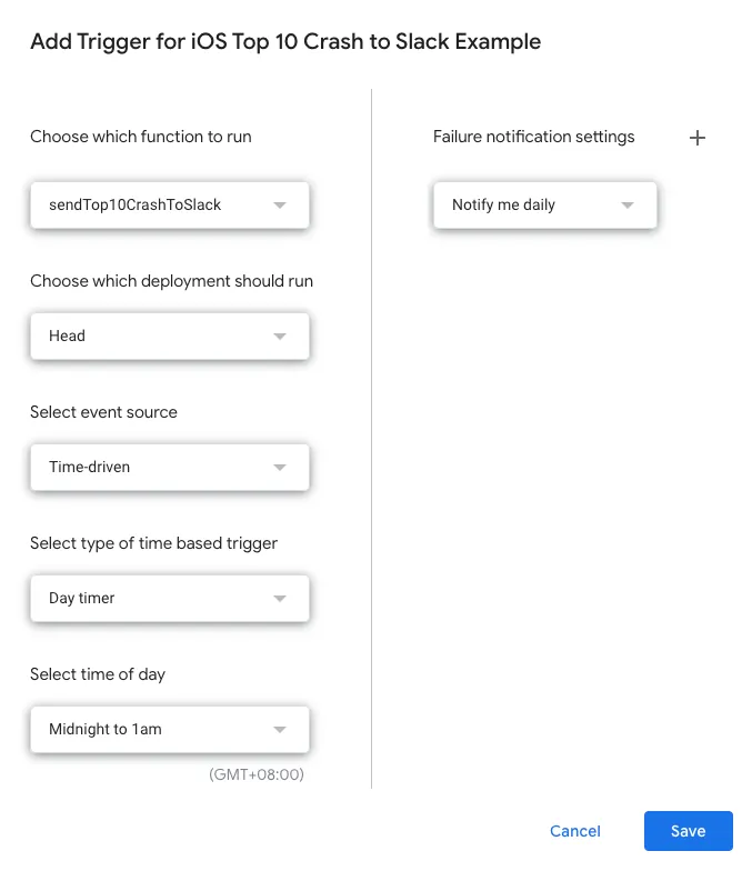 The first “Choose which function to run” (the entry point for the function to execute) should be changed to sendTop10CrashToSlack. The schedule can be set according to personal preference.