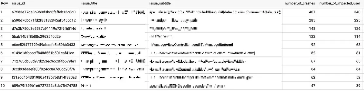 However, the official example’s query results are sorted differently from what Crashlytics shows, likely because it groups by blame_frame.file (nullable) and blame_frame.line (nullable).