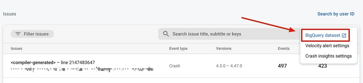 First, go to your Firebase project -> Crashlytics -> click the “•••” at the top right of the list -> select “Go to BigQuery dataset”.