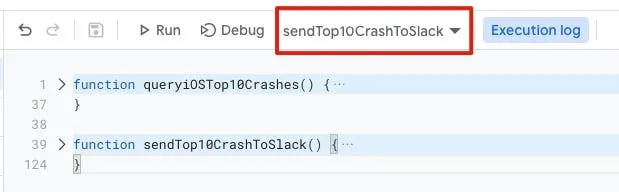 Next, select the “sendTop10CrashToSlack” function above, then click Debug or Run to test it once; since the first run requires authentication, please run it at least once before proceeding to the next step.