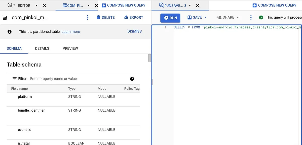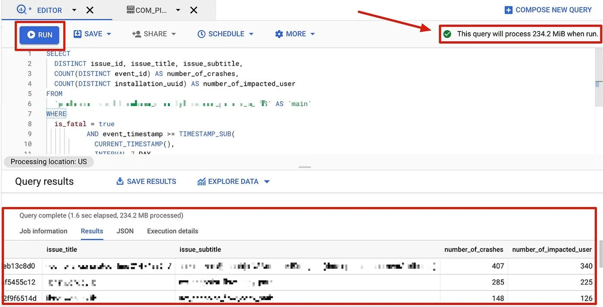 After setting the Crashlytics Log to Big Query import cycle and completing the first data import, we can start querying the data.