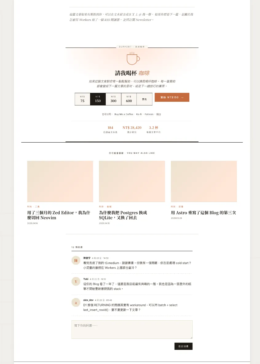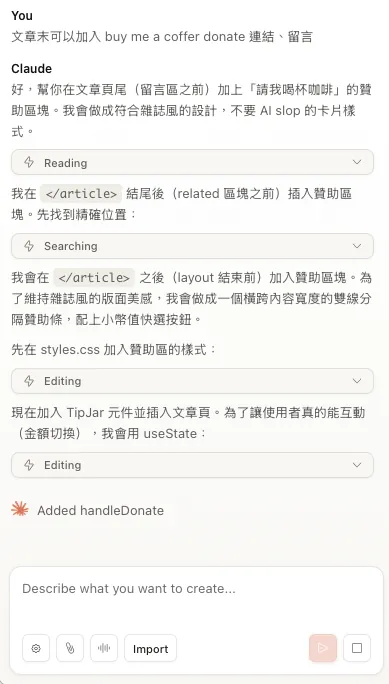 You can continue the conversation with the AI to add the features you want or adjust existing ones. For example, if I want to add a “buy me a coffee” donation link and comments at the end of articles, I can tell it: