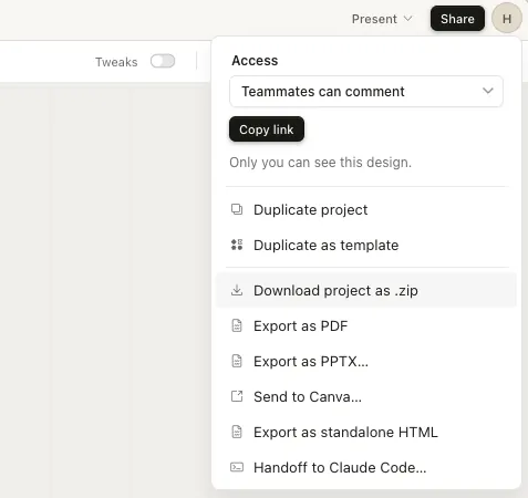 After you are satisfied with the design, click the top right “Share” -> “Download project as .zip” to download the original design files: