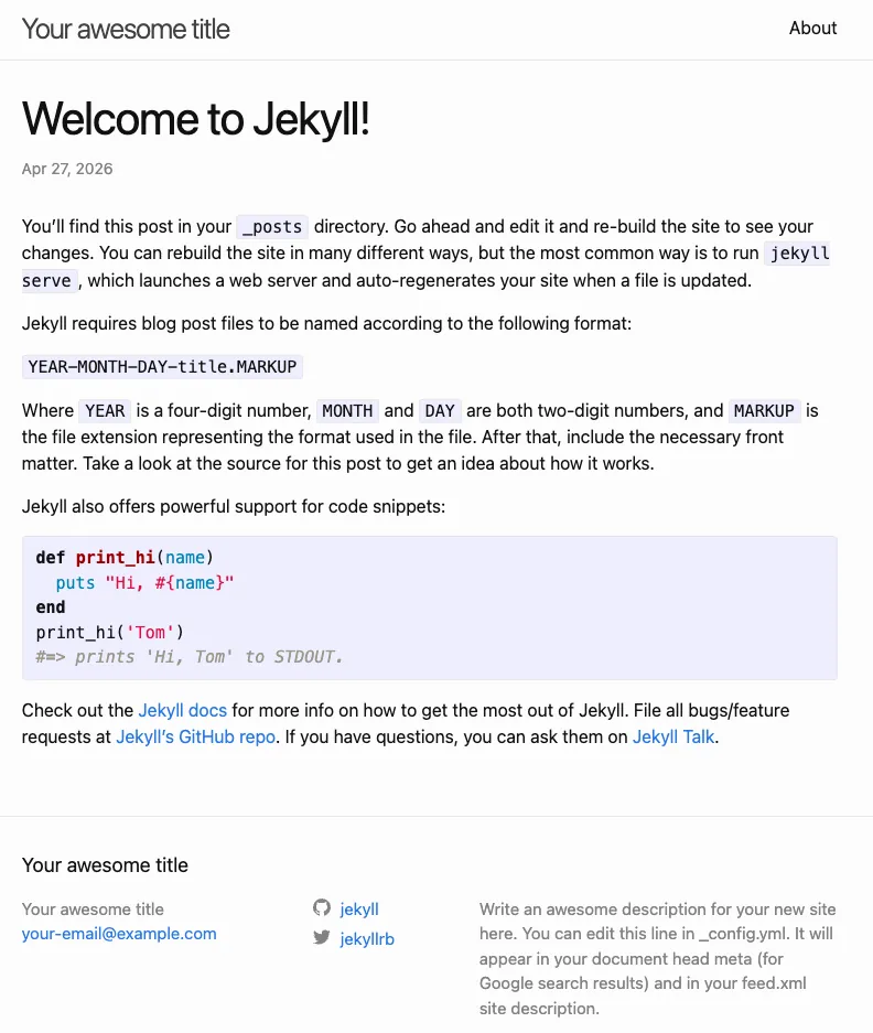 Run bundle exec jekyll serve and open http://127.0.0.1:4000/ to see the result: