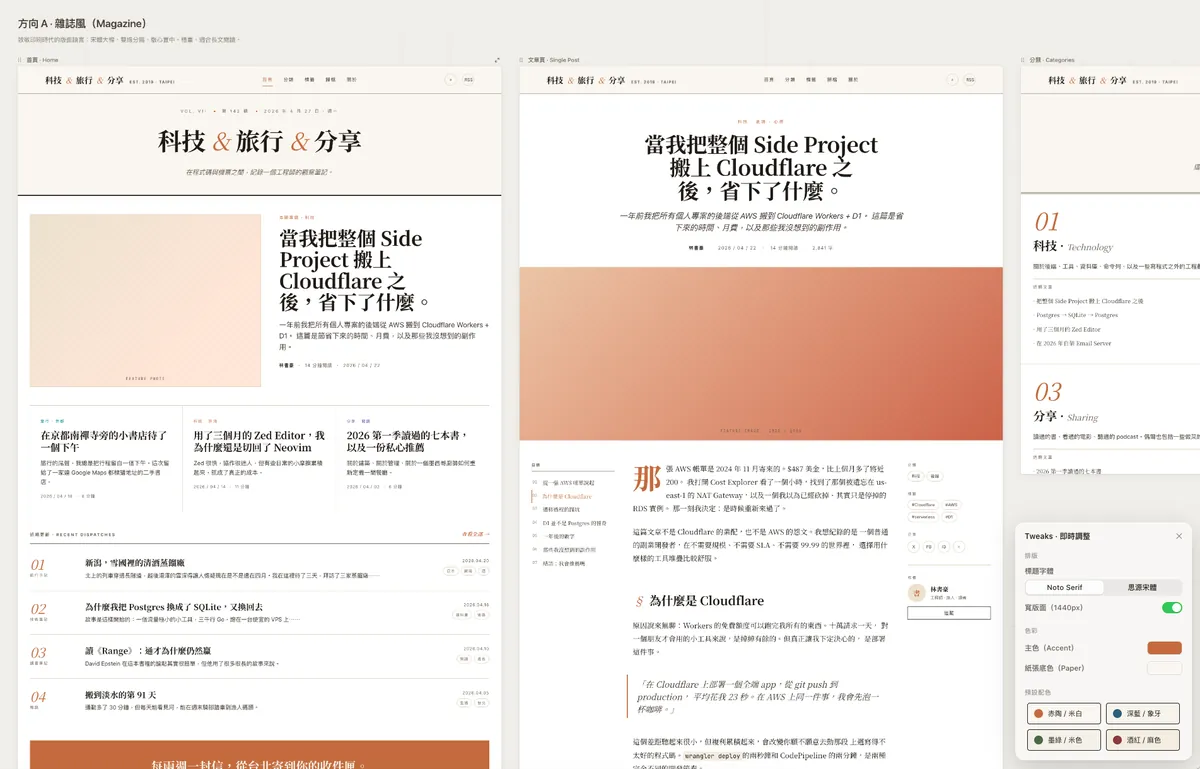 It wasn’t until the arrival of Claude Design + Claude Code that I finally took the plunge and asked AI to help me design the blog style and implement the functional pages I wanted.