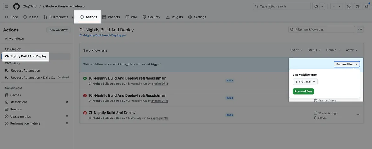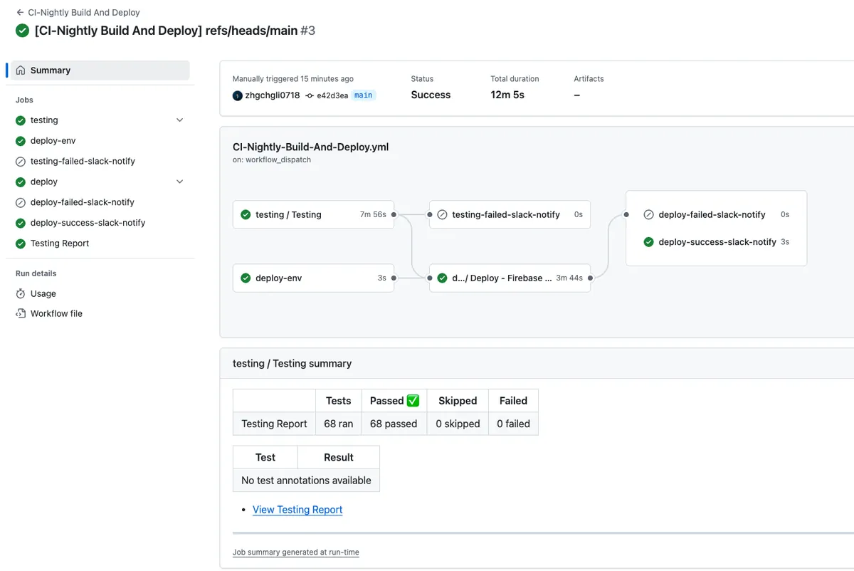 This Action directly reuses the previously designed CI-Testing and CD-Deploy, combining them into our Nightly Build. It is very flexible and easy to use!