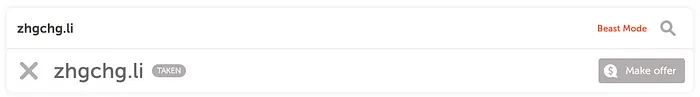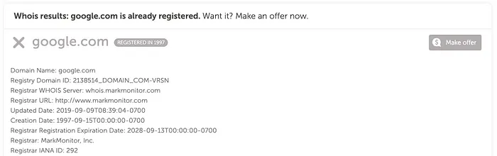 If the button on the right shows “Make offer” or “Taken,” it means the domain has already been registered. Please choose a different extension or try another domain name: